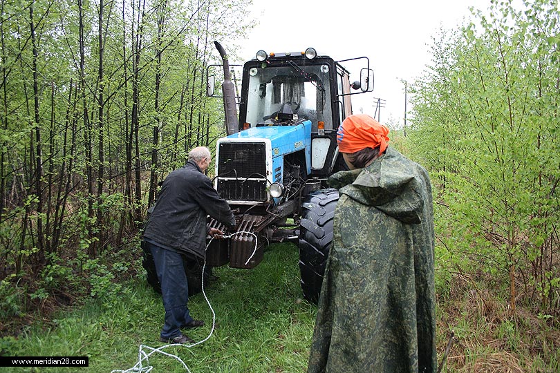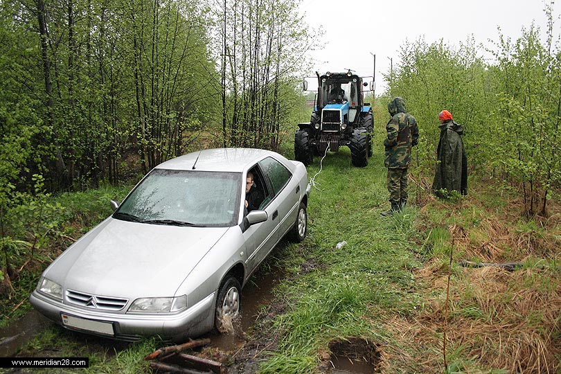 Переехав через насыпь, мы наглухо «садимся» на заболоченной дороге. Переднеприводный Citroen просто лежит на днище и не может взять грунт. Самоспасение результатов не дало, пришлось идти искать трактор в ближайшую деревню. Задача оказалась не такой уж и легкой — в будний день все на работе. Однако, одного укротителя тракторов все же получилось вырвать с ремдвора колхоза. С помощью мата и троса автомобиль удалось вытащить на твердую землю. На мероприятия по спасению «железного коня» ушло порядка