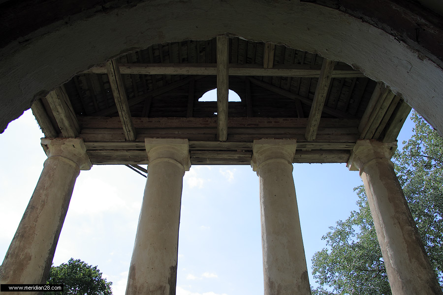 Центр главного фасада выделен четырехколонным портиком с треугольным фронтоном.