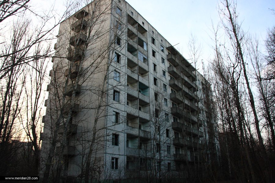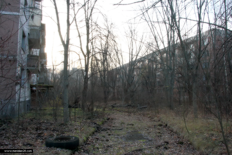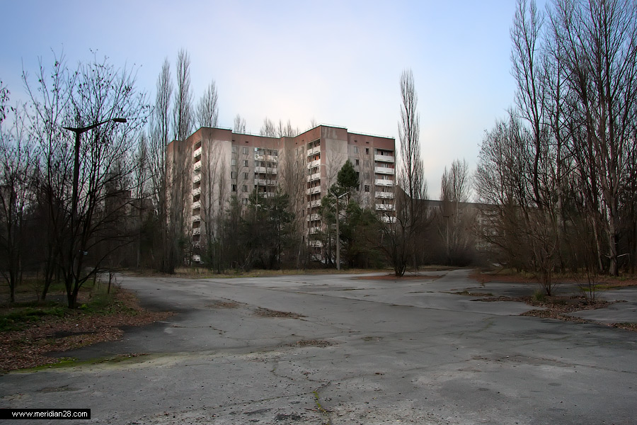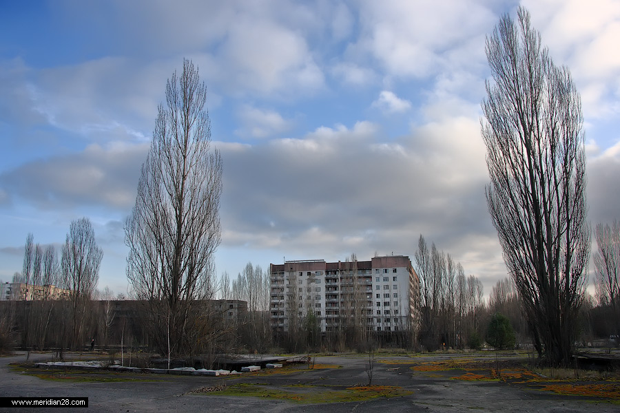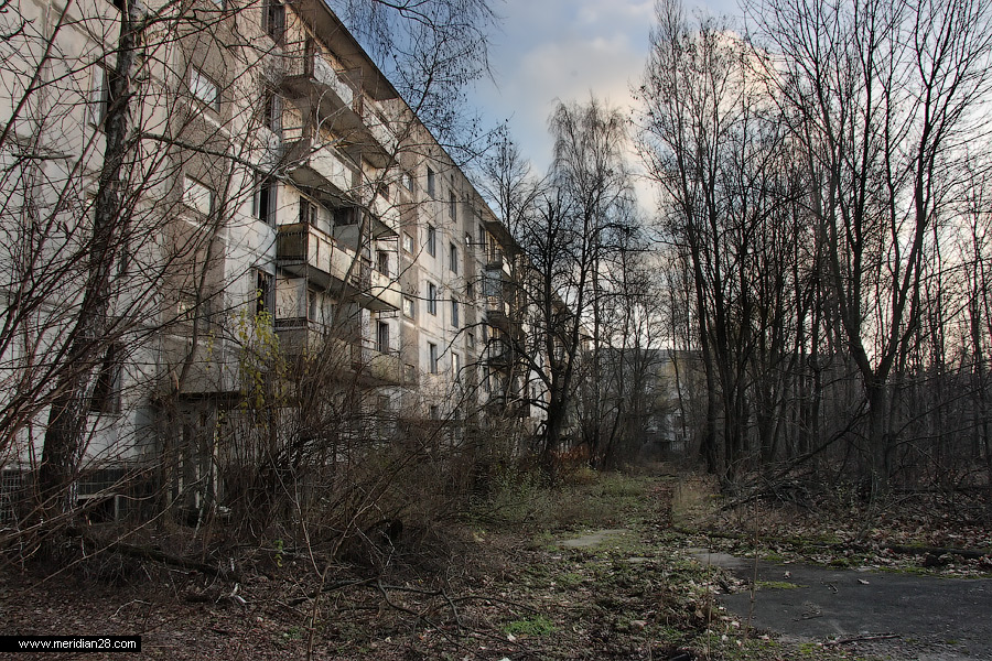 Вид на южную часть города с центральной площади. Прямо по курсу все тот же дом по улице Курчатова. Всего в Припяти было 5 микрорайонов. По проекту существовало 2 проспекта — проспект Ленина и проспект Строителей — и 9 улиц — Курчатова, Спортивная, Гидропроектовская, Дружбы народов, Леси Украинки, Сержанта Лазарева, Набережная, Огнева, Заводская.