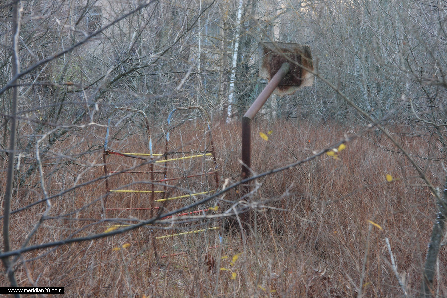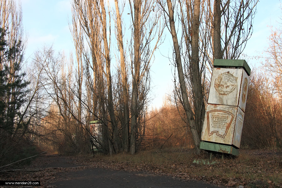 Вдоль дороги стоят знаки радиационной опасности. Действительно, лишний раз лучше никуда не выходить. Часть пути в Припять пролегает через так называемый «Рыжий лес» — участок леса, принявший на себя наибольшую долю выброса радиоактивной пыли во время взрыва реактора. Ныне этот лес уничтожен.