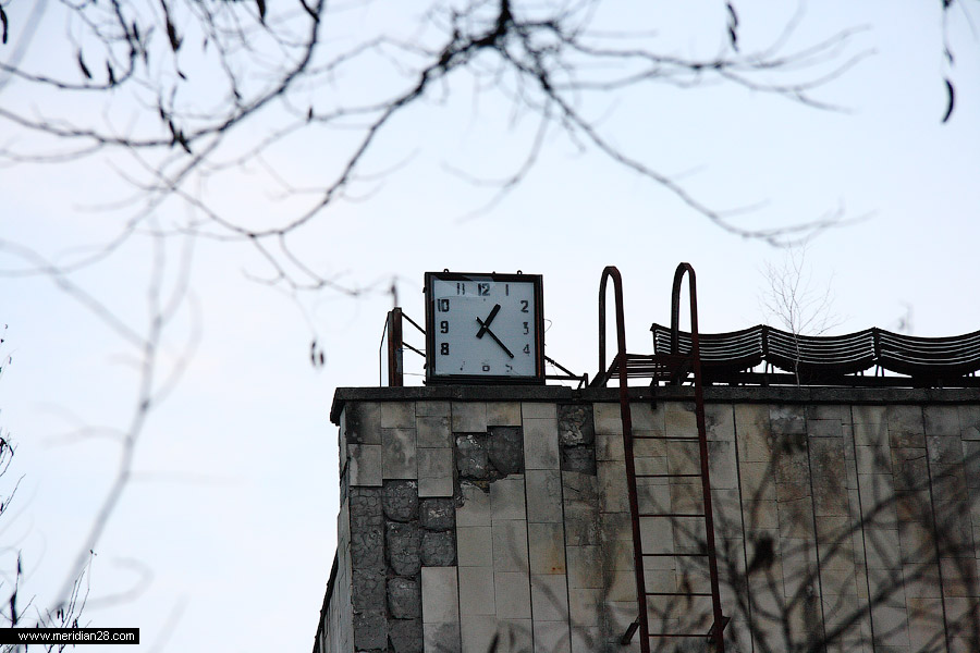 Часы на бассейне «Лазурный». На часах 1:23 — время взрыва на АЭС. Никакой трагической таинственности — часы перевели местные «сталкеры» для антуража, они же и покрасили гербы на высотках.