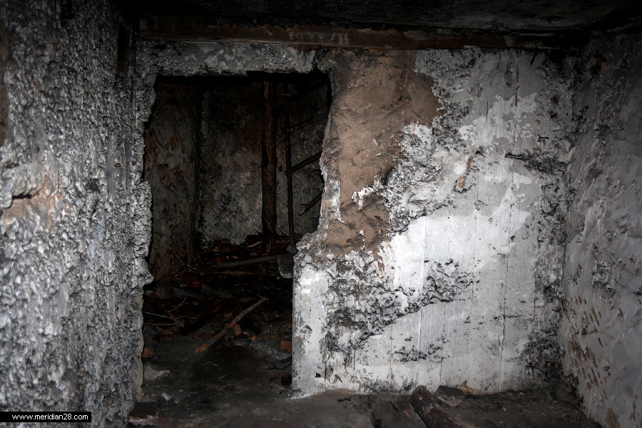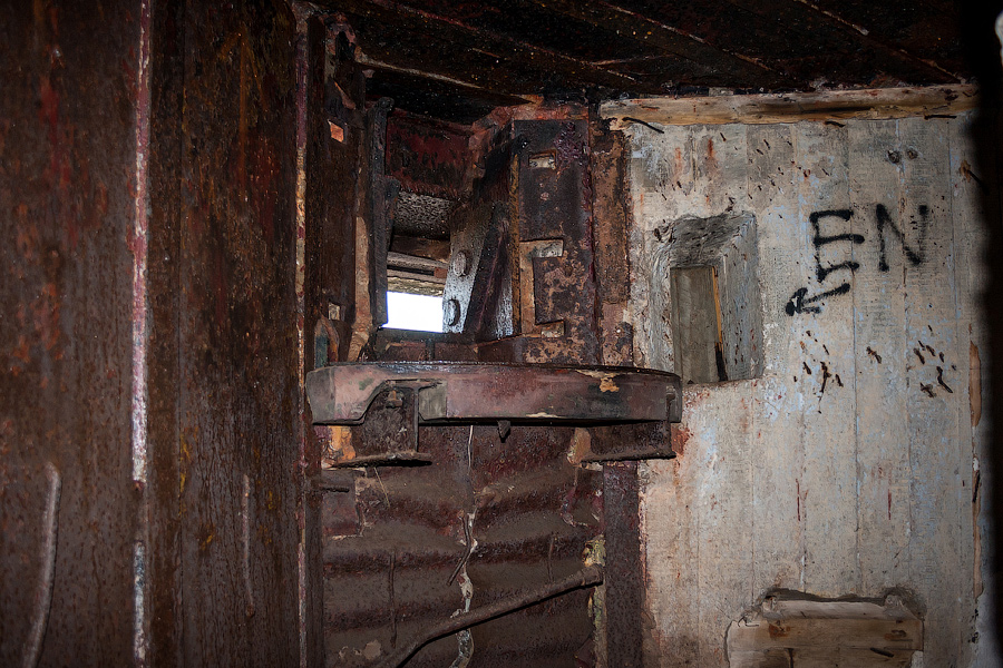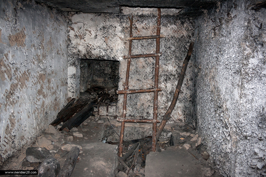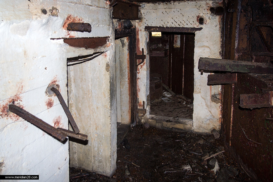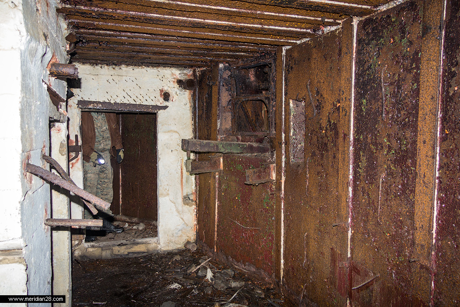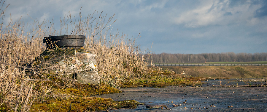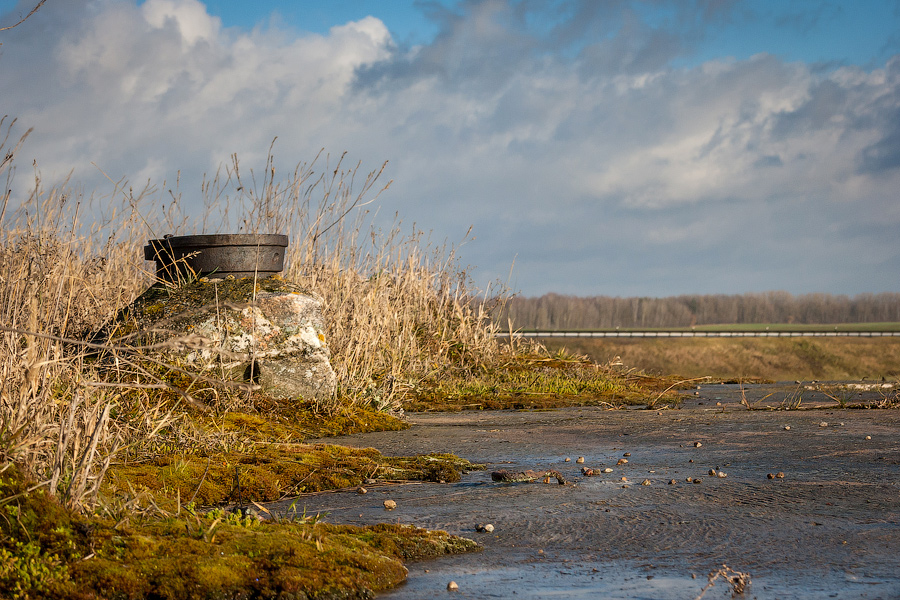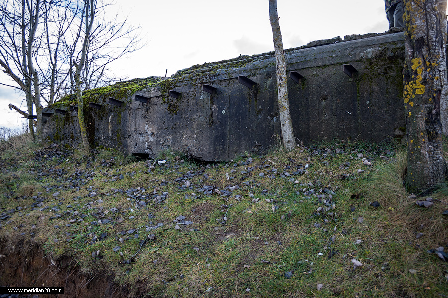 Поискав примерное расположение фортификационных объектов данного участка в ряде источников, воскресным утром мы выдвигаемся в деревню Клыповщина. Поиск огневой точки не занял много времени: она хороша видна со стороны автомобильной и железной дорог. Тип защиты огневой точки — М-2. ДОТ трехамбразурный. Внутри было достаточно чисто. На крыше ДОТа замечаем обсадную трубу перископа. На напольных стенах огневой точки имеются боевые повреждения.