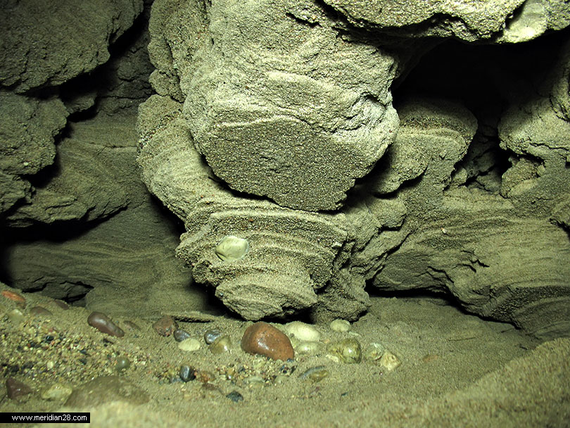 Однако вернемся к объективной реальности. Пещера находится на крутом берегу Гинькова озера, метрах в 30 от воды. Она вымыта в песчанике, пласты которого вероятнее всего появились здесь примерно 25 тысяч лет назад, во время последнего, Валдайского, обледенения. В радиусе 300 метров от пещеры встречается достаточно много выходов породы на поверхность.