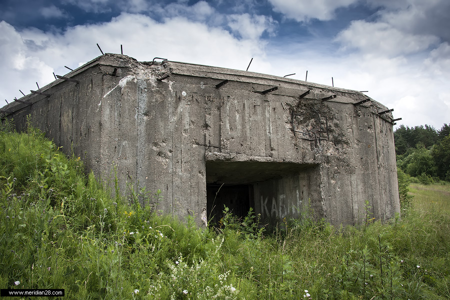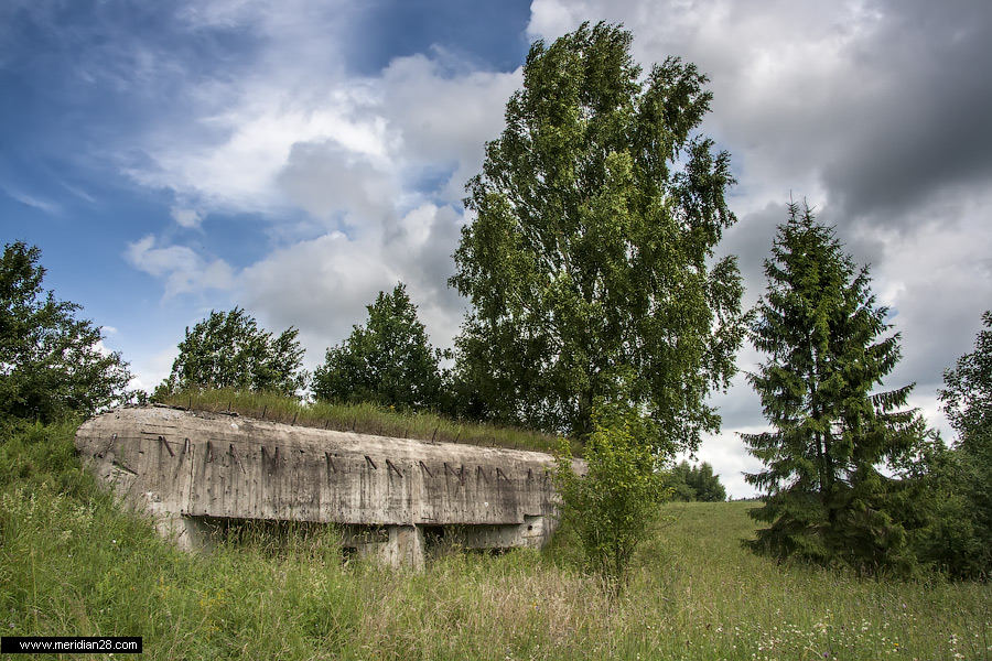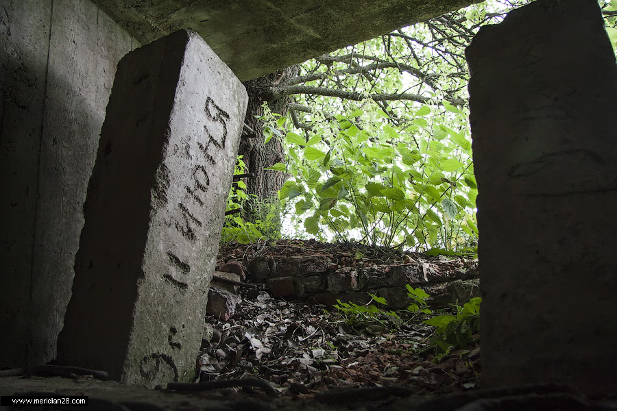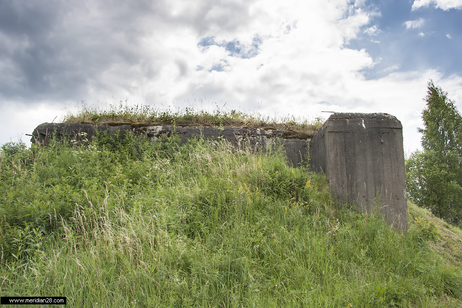 Приветливый дедушка подробно рассказал, как нам добраться до первого ДОТа. Нашли сооружение очень быстро. К сожалению, у нас нет точной нумерации опорного пункта, поэтому будем использовать свою, основанную на порядке осмотра. Первый ДОТ представлял собой орудийно-пулеметный полукапонир на два этажа.