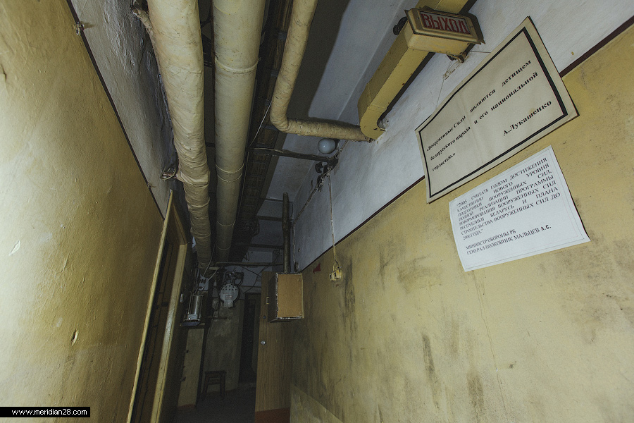 Под потолком видны коммуникации: вентиляционные короба, электрические кабели и прочие. На стенах сохранились напоминания о периоде использования объекта вооруженными силами Беларуси.