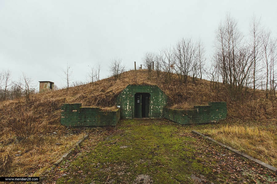 Так выглядит основной вход защищенного командного пункта 95-ой истребительной авиационной дивизии. На заднем фоне виднеются киоски оголовков вентиляционных каналов.